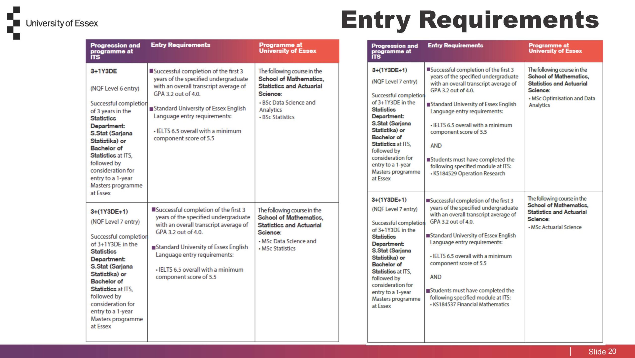A. Double degree program in bachelor will include 3-year study at ITS and 1-year (last year) at Essex with degree S.Stat. (Statistics ITS) and B.Sc. of Data Science and Analytics or B.Sc. in Statistics (Essex, student’s choice)