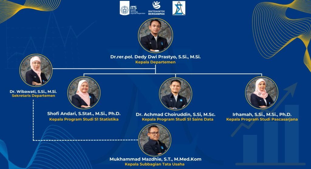 Sejalan dengan Struktur Organisasi dan Tata Kelola ITS pada periode 2025-2029, Departemen Statistika melakukan perubahan struktur organisasi. Saat ini Departemen Statistika dipimpin oleh seorang Kepala Departemen dan seorang Sekretaris Departemen. Program Studi Pascasarjana, yang terdiri dari Program Studi S2 Statistika dan S3 Ilmu Statistik, dikelola oleh Kepala Program Studi Pascasarjana. Ada dua Program Studi Sarjana yang masing-masing dipimpin oleh Kepala Program Studi S1 Statistika dan Kepala Program Studi S1 Sains Data. Ada lima laboratorium yang mana masing-masing dipimpin oleh seorang Kepala Laboratorium. Subkoordinasi terkait dengan administrasi diatur oleh Kepala Subbagian untuk melaksanakan operasional administrasi. Struktur organisasi lengkap Departemen Statistika ITS adalah sebagai berikut.