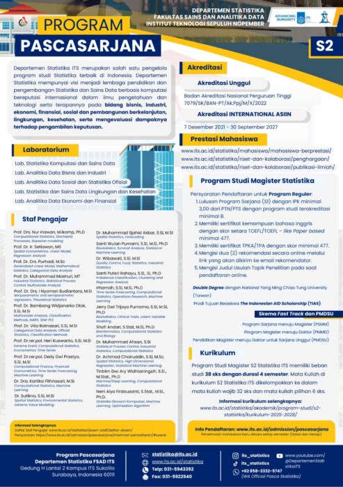 The Department of Statistics, Faculty of Science and Data Analytics, Institut Teknologi Sepuluh Nopember (ITS), is pleased to announce the opening of admissions for the Master’s Program (S2) in Statistics. The program is designed to develop advanced competencies in statistics and data science with a computational approach, supporting applications in various sectors such as business, industry, economics, finance, social development, environment, and health.