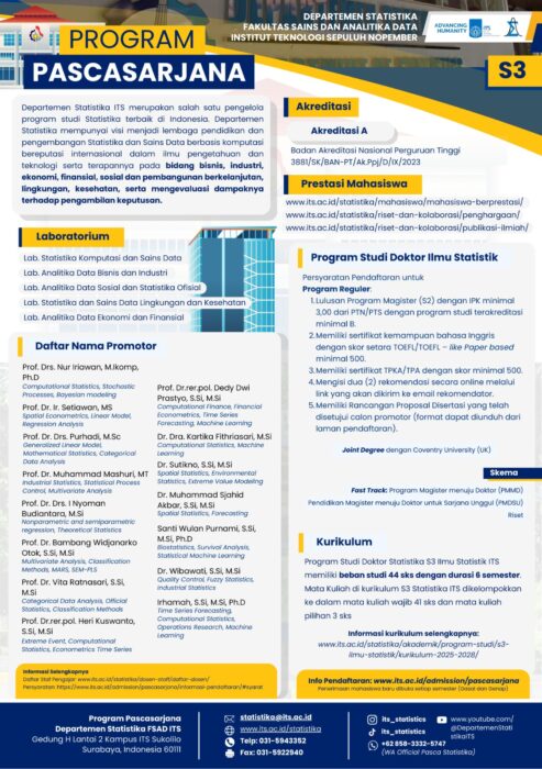 Departemen Statistika, Fakultas Sains dan Analitika Data (FSAD), Institut Teknologi Sepuluh Nopember (ITS) membuka pendaftaran mahasiswa baru untuk Program Studi Doktor (S3) Ilmu Statistik. Program ini dirancang untuk mengembangkan kemampuan riset dan keahlian lanjutan di bidang statistika dan sains data berbasis komputasi yang dapat diterapkan pada berbagai sektor, seperti bisnis, industri, ekonomi, finansial, sosial, lingkungan, dan kesehatan.