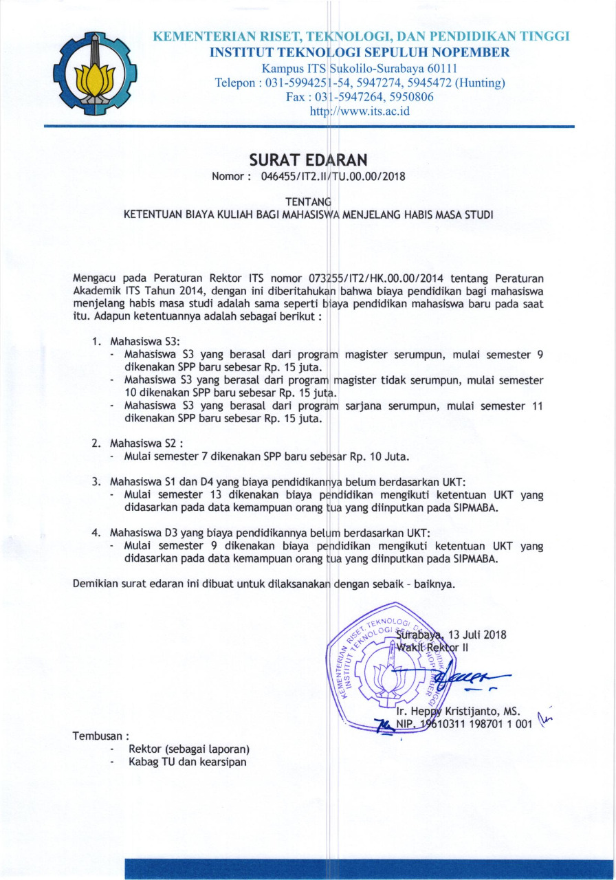 Mengacu pada peraturan Rektor ITS Nomor 073255/IT2/HK.00.00/2014 tentang peraturan akademik ITS tahun 2014, dengan ini diberitahukan bahwa biaya pendidikan bagi mahasiswa menjelang habis masa studi adalah sama seperti biaya pendidikan mahasiswa baru pada saat itu, Adapun ketentuanya dapat dilihat pada surat edaran dibawah ini.