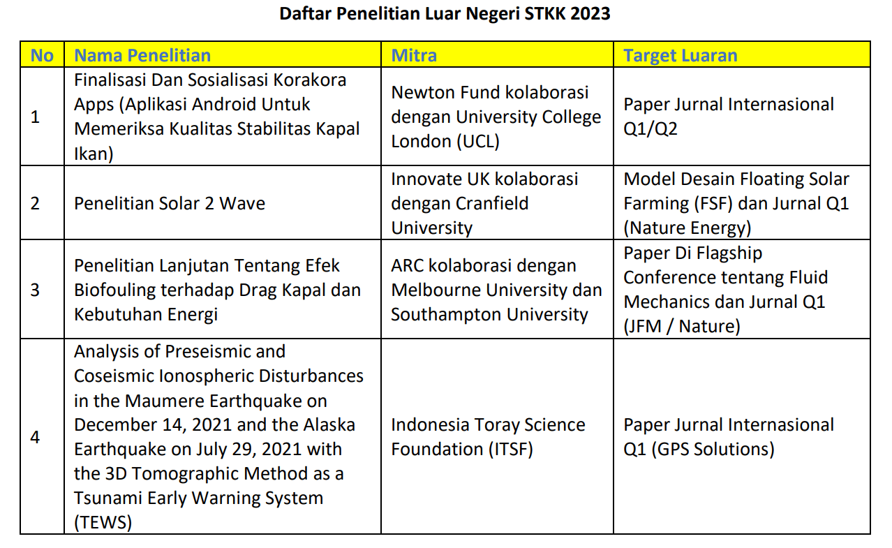Pusat Penelitian STKK (Sains Teknologi Kelautan dan Kebumian) DRPM ITS terus menggalakkan berbagai kerja sama riset luar negeri dengan berbagai negara. Di awal tahun 2023 ini, STKK berhasil melahirkan 4 kerja sama luar negeri dengan skema hibah. Penelitian ini akan menghasilkan publikasi jurnal internasional Q1 maupun Q2 yang terindeks scopus.
