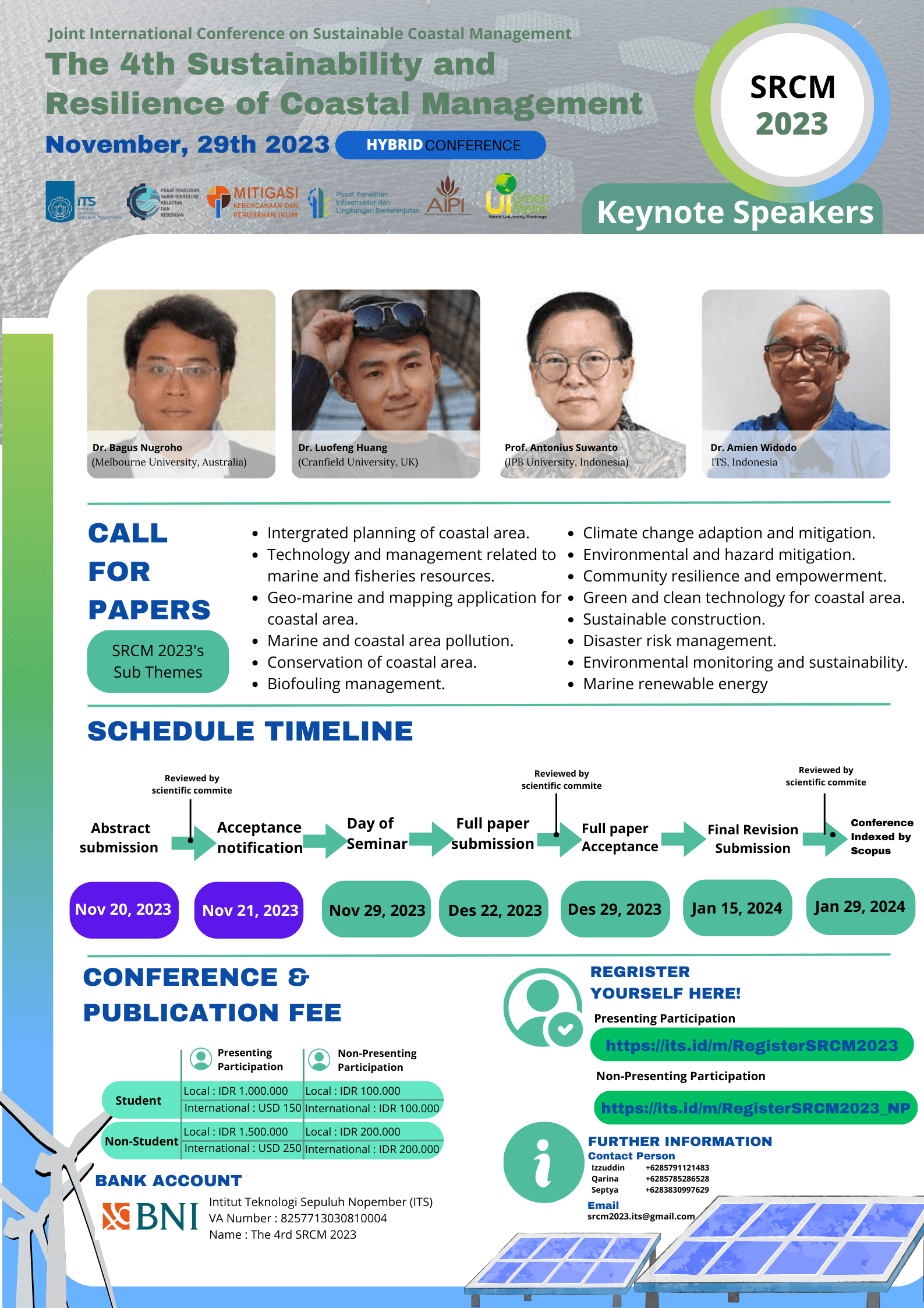 The Joint International Conference on the 4th Sustainability and Resilience Coastal Management, abbreviated as SRCM is an international conference held by the Center for Marine and Earth Science and Technology Research (Puslit STKK) in collaboration with the Center for Sustainable Infrastructure and Environmental Research (PILB) and the Center for Disaster Mitigation Research and Climate Change (Puslit MKPI) which is part Sepuluh Nopember Institute of Technology (ITS).