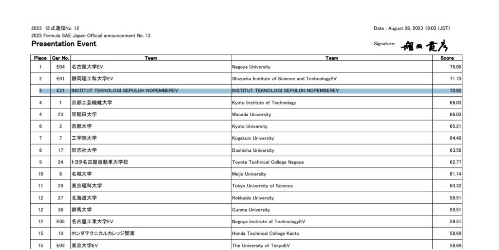 Tim Anargya ITS menempati posisi ketiga kategori Static Event pada cabang Business Plan dalam ajang bergengsi Formula Society Automotive Engineer (FSAE) Japan 2023