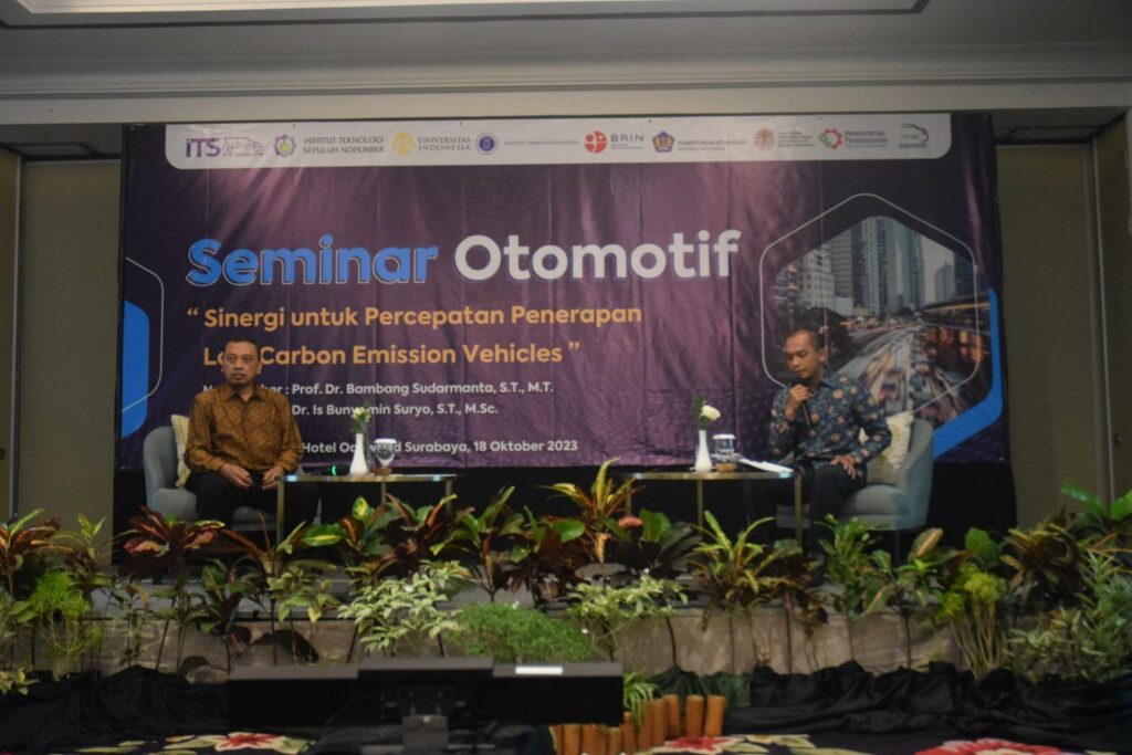 Surabaya, ITS News — Untuk mengurangi emisi karbon yang dihasilkan oleh kendaraan bermotor, low carbon emission vehicle (LCEV) bisa menjadi salah satu solusi. Membahas lebih dalam, Manajer Klaster Sains Techno Park (STP) Otomotif Institut Teknologi Sepuluh Nopember (ITS) menyampaikan hasil penelitiannya pada Seminar Otomotif dengan tema Sinergi untuk Percepatan Penerapan LCEV.