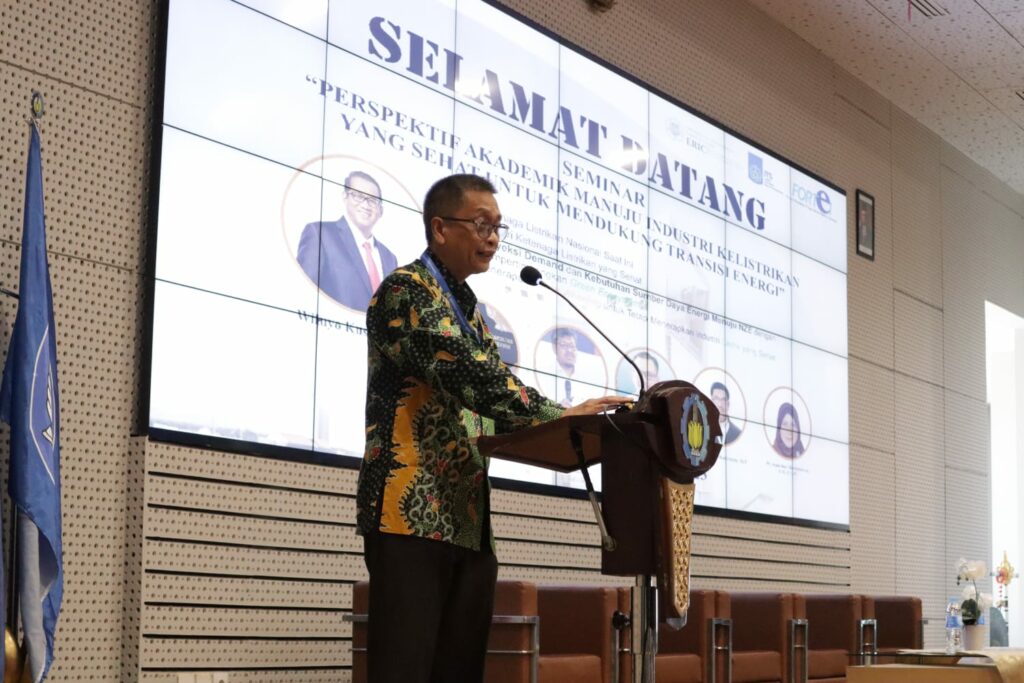 Kepala Puslit EB ITS, Prof Dr Ir Tri Widjaja MEng ketika memberi sambutan mengawali seminar Perspektif Akademik Menuju Industri Kelistrikan yang Sehat Untuk Mendukung Transisi Energi