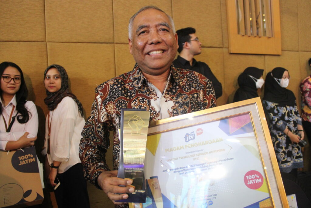 Wakil Rektor I Bidang Akademik dan Kemahasiswaan ITS Prof Dr Ir Adi Soeprijanto MT menunjukkan piala penghargaan Jatim Bangkit Awards 2023 di malam penganugerahan