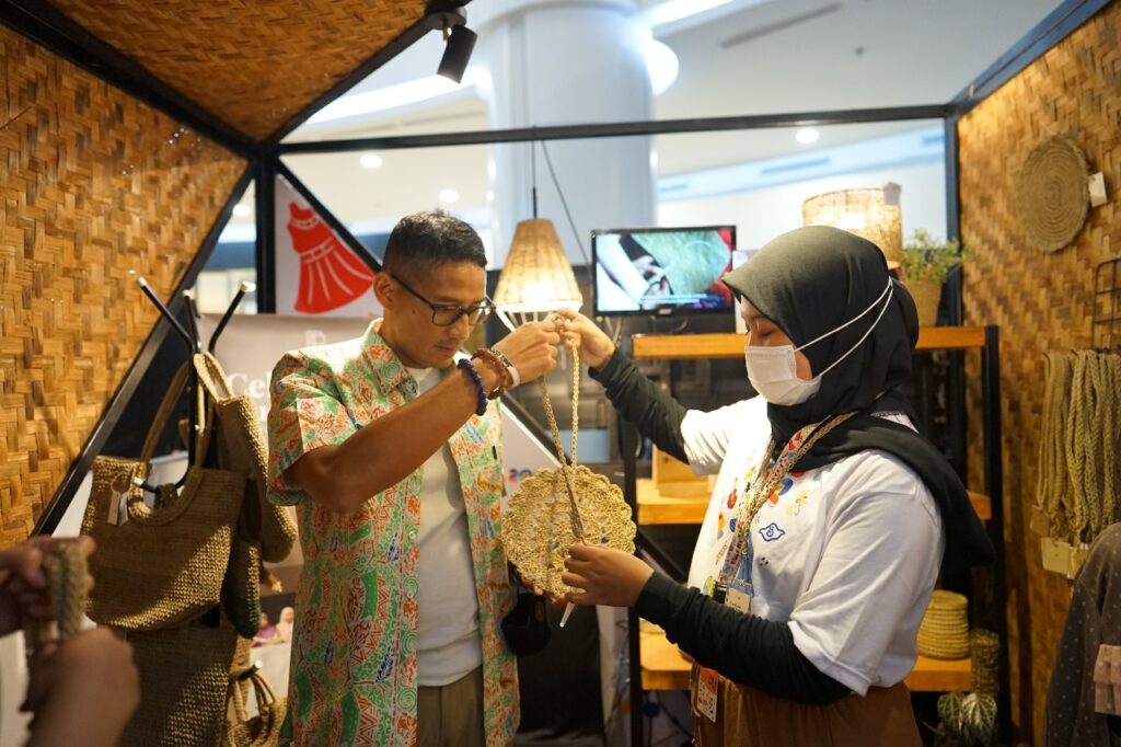 Founder Cekka Studio Nurul Idzi (kanan) saat menyambut Menteri Pariwisata dan Ekonomi Kreatif (Menparekraf) RI Sandiaga Salahuddin Uno mengunjungi booth Cekka Studio