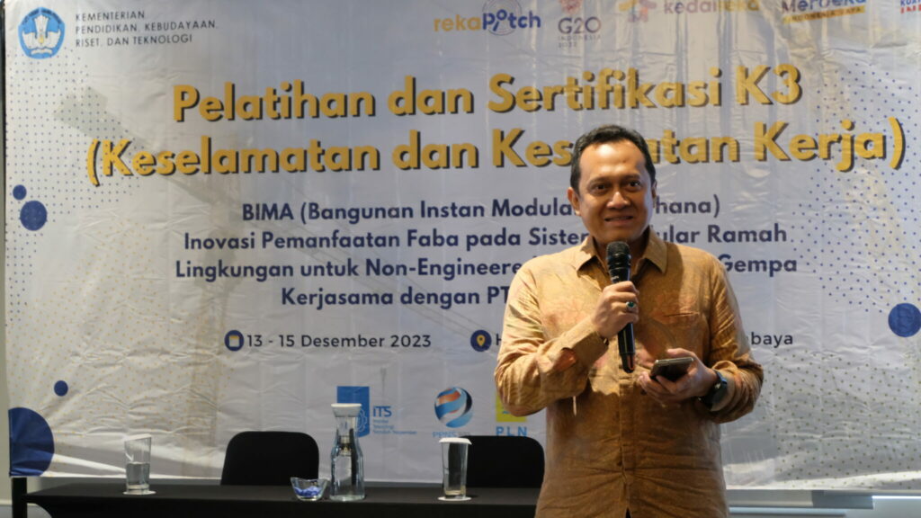 Kampus ITS, ITS News — Menindaklanjuti pengembangan inovasi rumah tahan gempa Bangunan Instan Modular Sederhana (BIMA), Institut Teknologi Sepuluh Nopember (ITS) menggelar Pelatihan dan Sertifikasi Keselamatan dan Kesehatan Kerja (K3). Bekerja sama dengan PT PLN, perhelatan tersebut digelar di Novotel Samator Surabaya, Rabu (13/12).