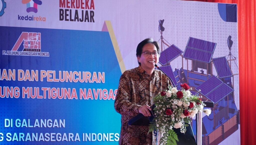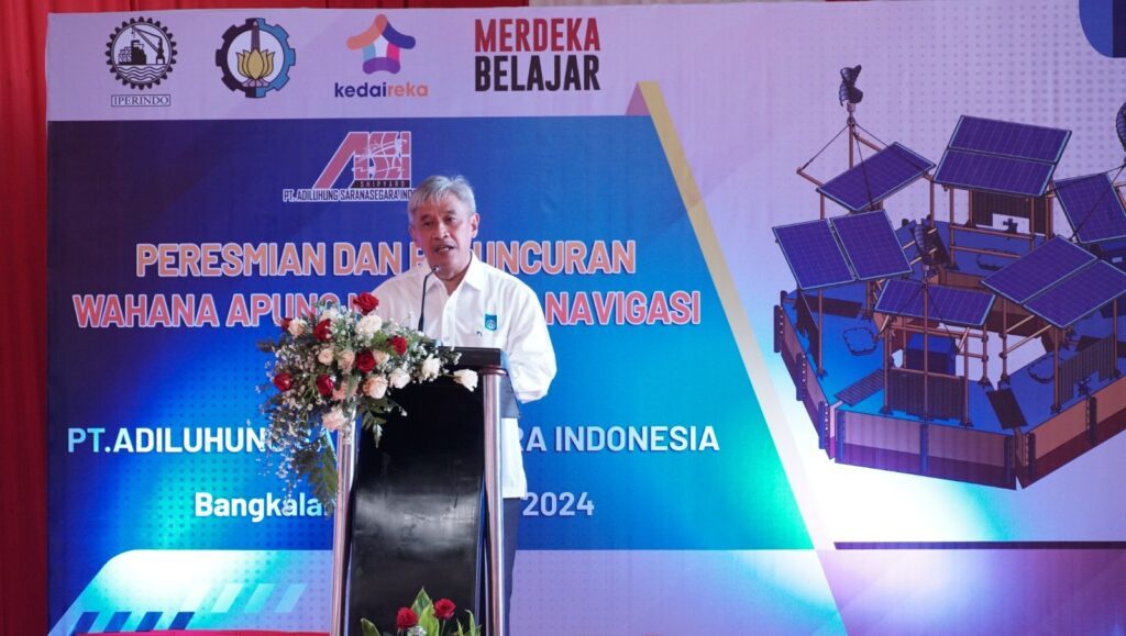 Ketua MF Kedaireka ITS x PT ASSI Prof Ir Raden Sjarief Widjaja PhD saat memberikan sambutan pada acara peresmian dan peluncuran Wahana Apung Multiguna Navigasi