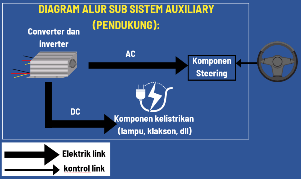 Pada kendaraan listrik dibutuhkan sub sistem auxiliary (pendukung) untuk mendukung proses operasi kendaraan listrik. Sub sistem auxiliary terdiri dari converter dan inverter, komponen kelistrikan dengan kebutuhan listrik low voltage DC, Komponen steering dengan kebutuhan listrik AC dan baterai dengan kebutuhan daya high voltage DC.