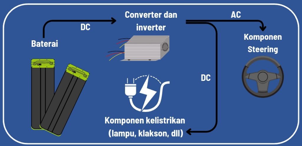 Baterai adalah sumber energi utama pada kendaraan listrik yang menghasilkan arus searah (DC). Oleh karena itu, untuk mengatur atau mengubah arus listrik sesuai kebutuhan, diperlukan penggunaan converter dan inverter :