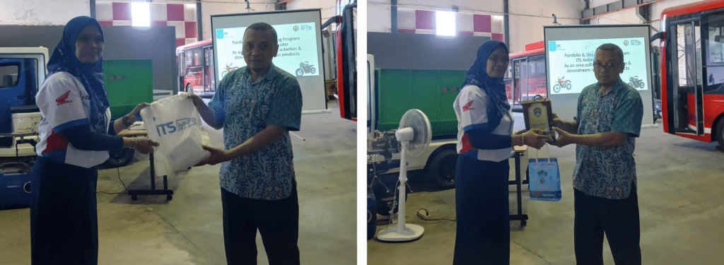 Setelah sesi sambutan dan pemaparan materi oleh Prof. Bambang Sudarmanta, Manager STP Otomotif dan Guru SMK Walisongo saling bertukar cinderamata sebagai tanda penghargaan.