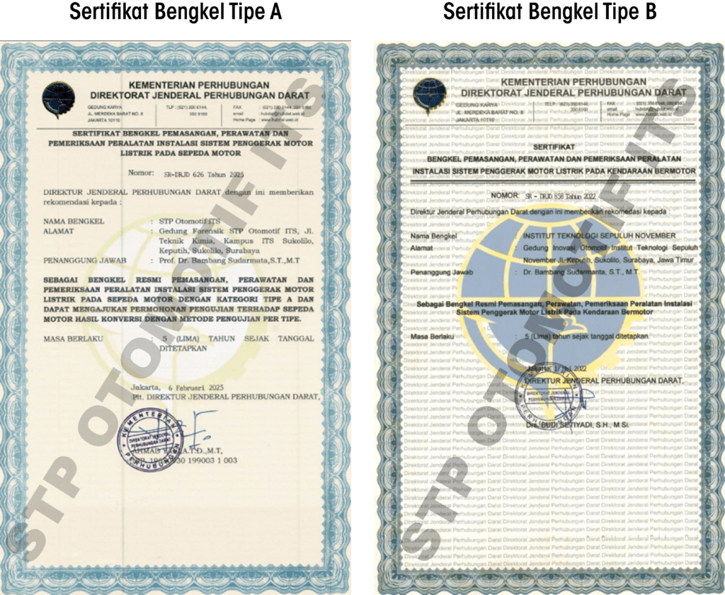 Bengkel Konversi Tipe A, memungkinkan STP Otomotif ITS untuk menjadi lokasi uji tipe kendaraan tanpa harus melalui Balai Pengujian Laik Jalan dan Sertifikasi Kendaraan Bermotor (BPLJSKB) di Kabupaten Bekasi, Jawa Barat. Dengan sertifikasi ini, STP Otomotif ITS dapat langsung melakukan uji tipe kendaraan listrik hasil konversi di bengkel sendiri. Hal ini, mempercepat proses pengurusan Sertifikat Uji Tipe (SUT) dan Surat Registrasi Uji Tipe (SRUT), menghemat waktu dan biaya bagi pelanggan, serta mempercepat proses pengurusan STNK baru.