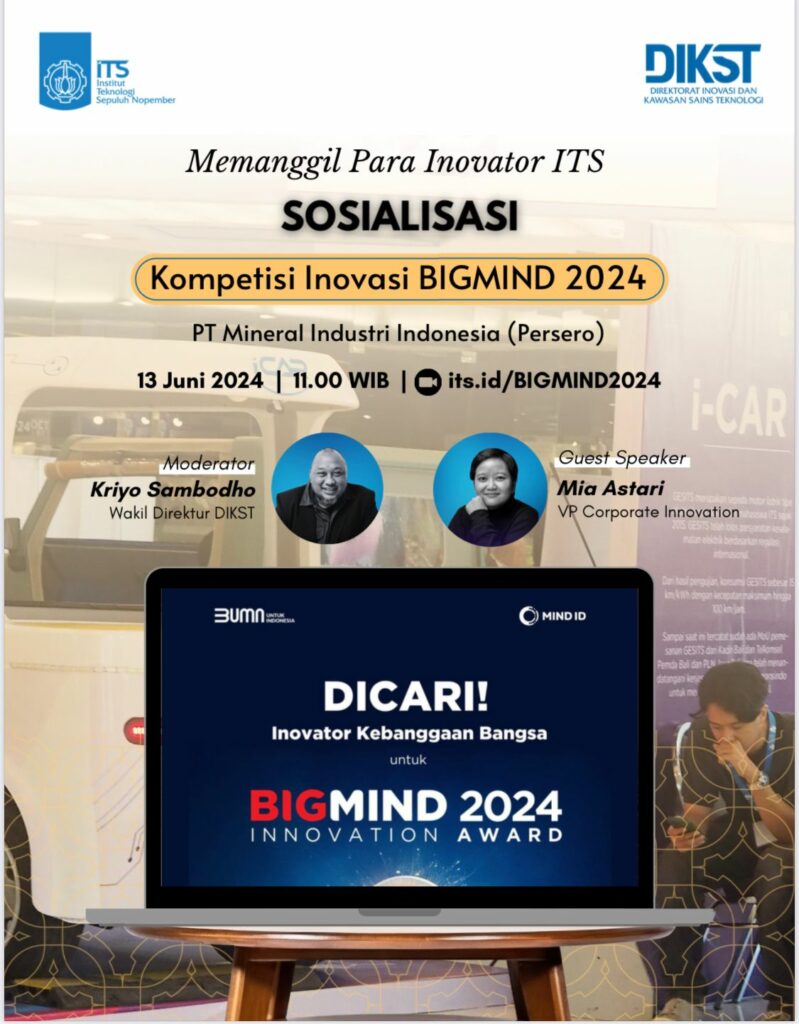 Memanggil seluruh inovator ITS pada acara Sosialisasi Kompetisi BIGMIND 2024 oleh MIND ID (PT Mineral Industri Indonesia)