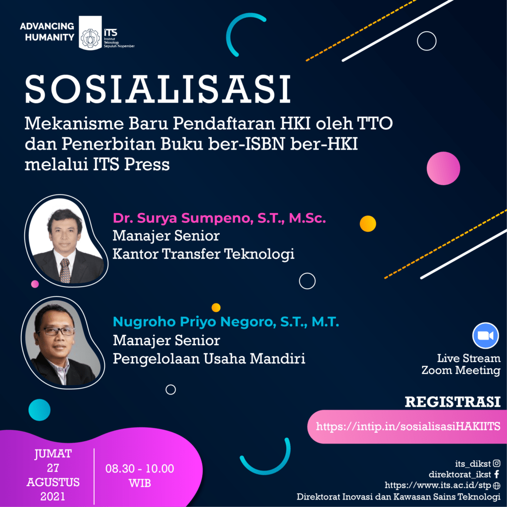 Direktorat Inovasi dan Kawasan Sains Teknologi menyelenggarakan Sosialisasi Mekanisme Baru Pendaftaran HKI oleh TTO dan Penerbitan Buku ber-ISBN ber-HKI melalui ITS Press yang akan dilaksanakan pada: