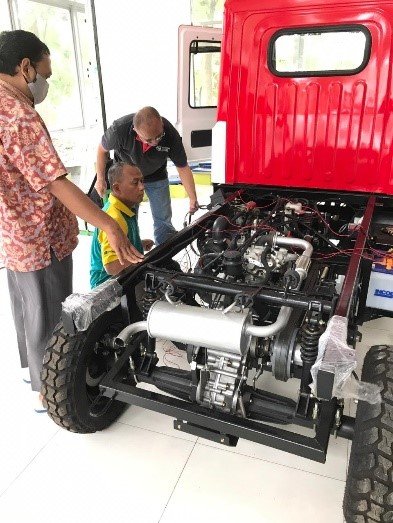The main innovative feature in this innovation research is the application of DDF technology using an electronic control unit (ECU) that is programmable and integrated with vehicle components. This programmable ECU is used to adjust the work output of the vehicle engine to the received load, in order to maintain performance and emission numbers, while still using alternative fuels. This programmable ECU controls the amount of intake of CNG fuel and air into the engine through the gas injector and the speed of the electric supercharger, while continuously examining engine operating conditions data through feedback from sensors installed in the engine, such as Throttle Position Sensor (TPS) and Hall sensor, to detect engine RPM. Before performing modifications to the vehicle, it is necessary to make preparations such as initial measurements, layout planning and design, DDF engine test drive, ECU programming and settings, and others. Therefore, these activities were conducted in the ITS PUI SKO and STP Otomotif facilities, which has the adequate equipment and tools to support vehicle research and testing, such as engine power and torque measurement using the Dynotest engine, vehicle weight measurement, and emission testing. Furthermore, other works such as modification of the vehicle chassis, and the construction of brackets to mount the gas fuel tanks were also carried out in the PUI SKO ITS and STP Otomotif facilities.