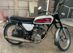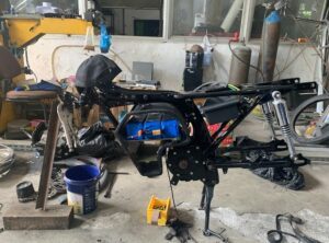 Chassis CB 100 dengan motor listrik terpasang di dudukan dan kotak baterai