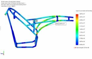 Setelah tahapan desain, dilakukan uji kelayakan chassis dengan menggunakan simulasi. Simulasi dilakukan menggunakan software ANSYS structural analysis untuk menguji kekuatan chassis dan ketahanannya terhadap deformasi dengan beban komponen yang terpasang