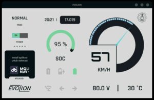 Komponen kelistrikan lain yang tidak kalah penting adalah sistem manajemen energi, Sistem ini digunakan sebagai penunjuk bagi pengendara untuk mengetahui parameter-parameter penting dalam kendaraan listrik, seperti SoC Baterai (State of Charge), temperatur baterai, kecepatan kendaraan, odometer jarak, dan indikator-indikator lainnya. Berikut tampilan dari sistem manajemen energi yang telah dibuat pada Gambar.