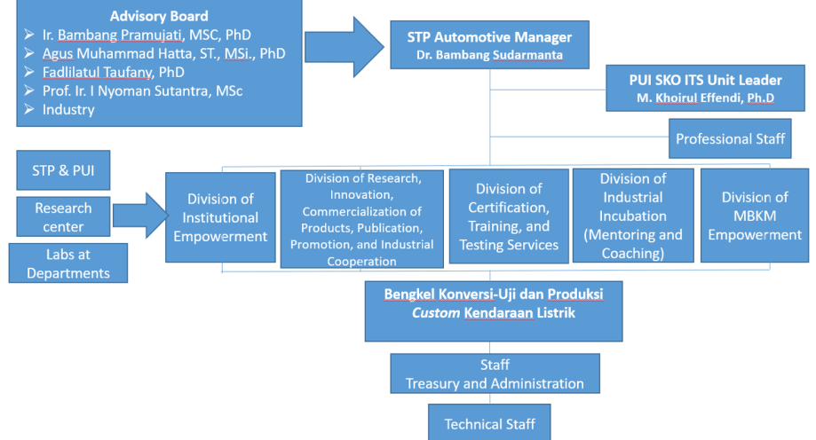 Kelembagaan STP Otomotif diawasi langsung oleh pimpinan kampus institut teknologi sepuluh nopember, kami terdiri dari beberapa divisi yang membantu memaksimalkan kinerja kami diantaranya :