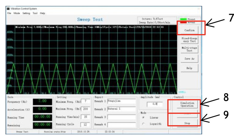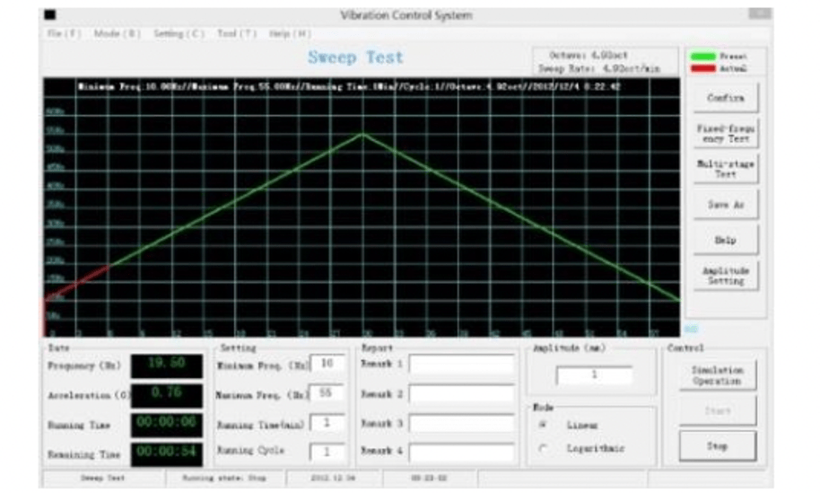 Pengaturan parameter seperti diatas berarti pengujian dilakukan dengan amplitudo 0.8mm dengan sinyal frekuensi yang berubah dari 7 Hz menuju 200 Hz dalam waktu 15 menit. Kemudian pengujian diulang sebanyak 12 kali sehingga memakan waktu total 3 jam.
