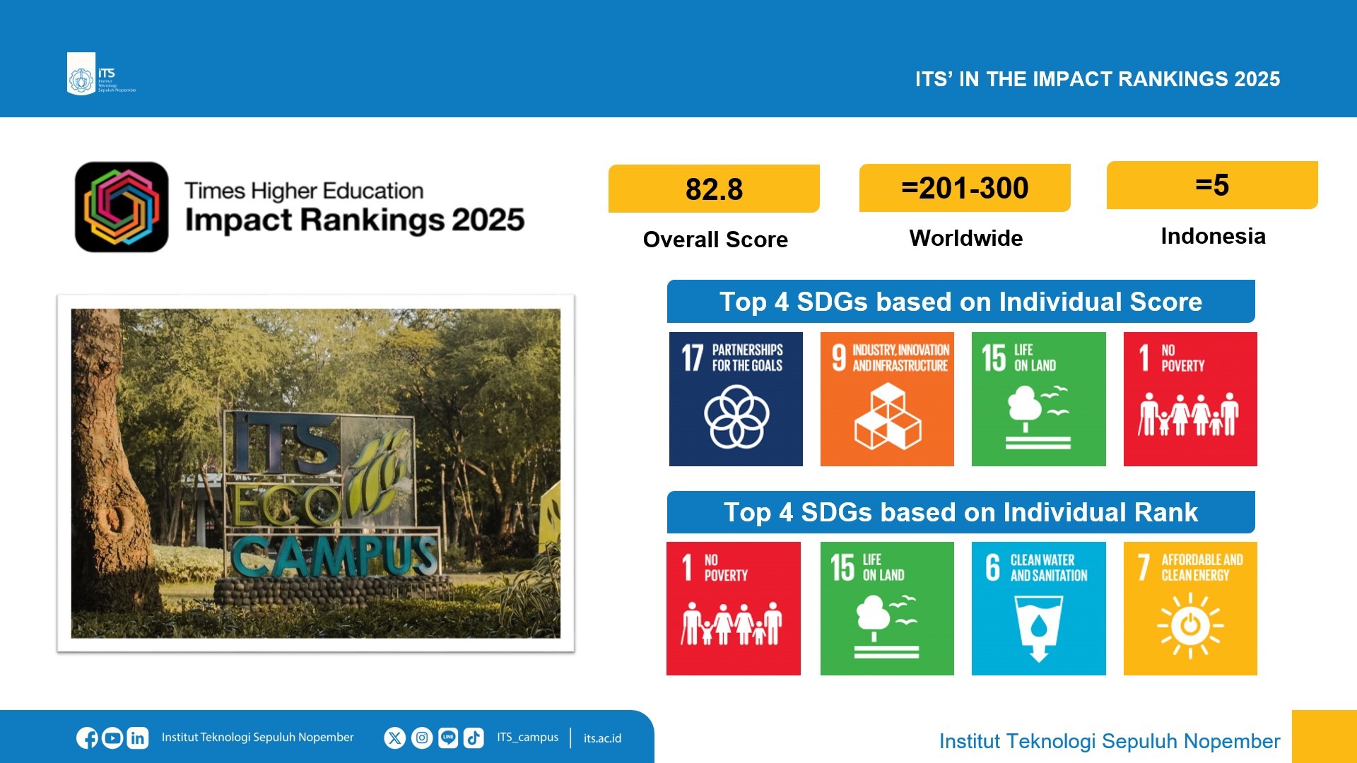 SDGs ITS is a program/institutional framework at the Sepuluh Nopember Institute of Technology that ensures the integration of the 17 Sustainable Development Goals in the tridharma (education, research, community service), campus governance, and daily culture—primarily through the Smart Eco Campus agenda and cross-sector partnerships.