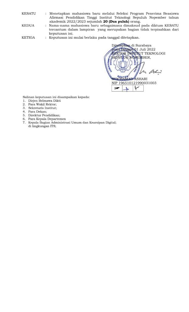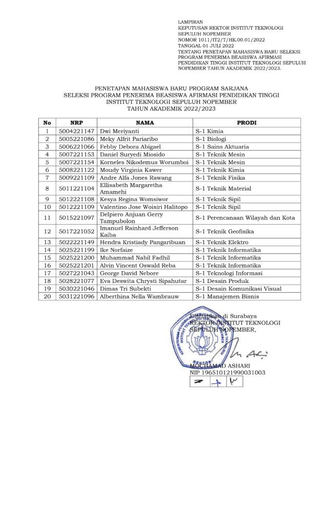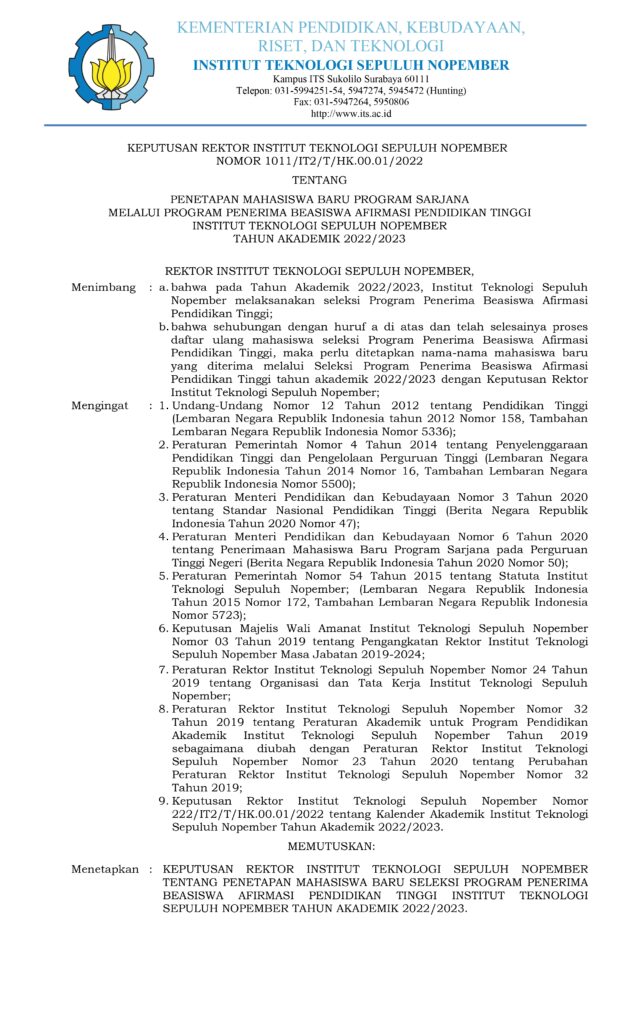 The following document is a rector’s decision containing a list of new students receiving ADIK scholarships at ITS in the 2022/2023 academic year.