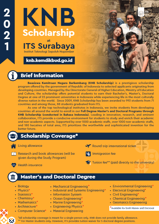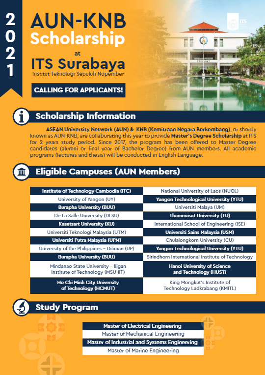 ASEAN University Network (AUN) & KNB (Kemitraan Negara Berkembang), AUN-KNB, are collaborating this year to provide a Master’s Degree scholarship at ITS for 2 years period. Since 2017, the program has been offered to Master’s Degree candidates from developing countries among AUN members. All academic programs (lectures and thesis) will be conducted in the English Language.
