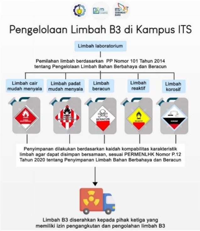 Hazardous and Toxic Waste (B3) on the ITS usually campus comes from laboratories. Departments that generate laboratory waste containing B3 waste include the Department of Chemical Engineering, Environmental Engineering, Chemistry, Materials and Metallurgical Engineering, Biology, and Mechanical Engineering. Sorting and packaging of B3 waste are conducted to facilitate safe storage, collection, and transportation, ensuring safety for the environment and human health. Packaging must be accompanied by symbols and labels. Laboratory managers sort B3 waste in the laboratory and store it for later transfer to a third party.