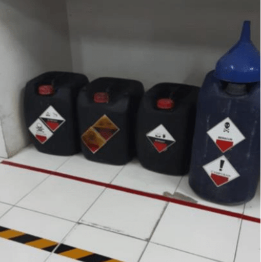 Temporary storage of non-medical waste, such as academic laboratory waste, is placed in labeled drums and containers according to the characteristics of each type of B3 waste. These are organized on shelves or in storage areas that have a roof and are protected from sunlight.