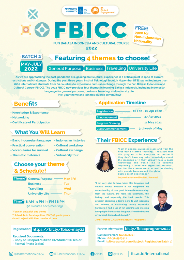 Institut Teknologi Sepuluh Nopember (ITS) proudly introduces the Fun Bahasa Indonesia and Cultural Course (FBICC), a unique and immersive program designed to enrich the cultural experience of international students. Rooted in Indonesia’s vibrant traditions and diverse heritage, FBICC at ITS offers a dynamic platform for students from across the globe to delve into the fascinating world of Bahasa Indonesia and the country’s rich cultural tapestry.