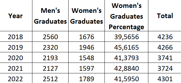 Institut Teknologi Sepuluh Nopember (ITS) conducts measurement and tracking for the likelihood for all students. In this process, the university also monitors and tracks women’s likelihood of graduating compared to men’s, and schemes in place to close any gap. The tracking is regularly done at the university level (through the Directorate of Education), faculty, and department levels. This table and graphic shows women’s graduation rate at ITS for 2018-2022.