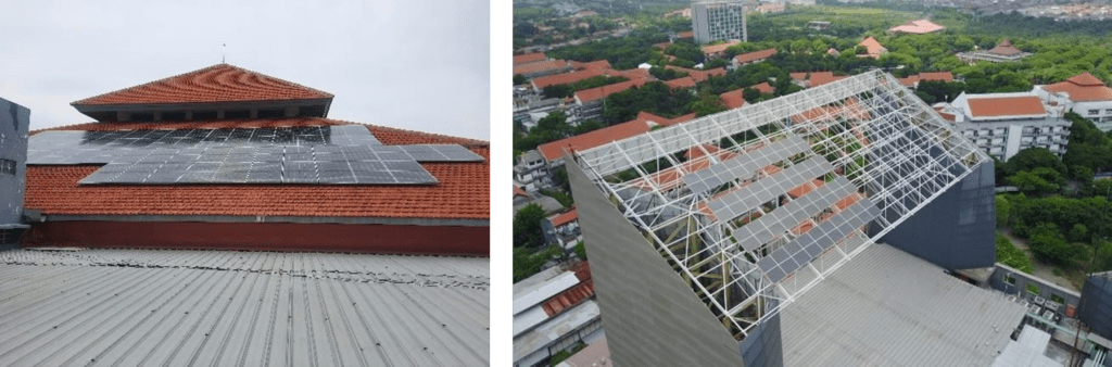Another examples are using solar power plants to support environmentally friendly energy in several buildings that can generate in total 332.472,9 kWh/ year, using vertical building gardens to make the environment cooler which results in less use of inverter air conditioners, optimizing rooms so that they get full lighting from the sun to minimize the use of lights and using LED lights to support energy efficiency, using electrical equipment with motion sensor and time control technology for less electricity usage, implement natural and mechanical ventilation systems in every study room and smart rooms to ensure effective and comfortable air circulation and temperature control with innovative technology to address the challenges of green building configuration energy needs.