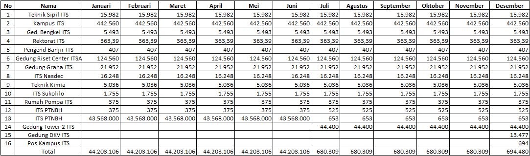To reduce energy dependence from the National Electricity Company (PLN), most of which still comes from non-renewable energy, ITS seeks to produce its own through renewable energy with a total of 333,905 kWh/ year and monitors the use of electricity from renewable energy to optimize usage and to check if there is any wastage energy. Here are the details: