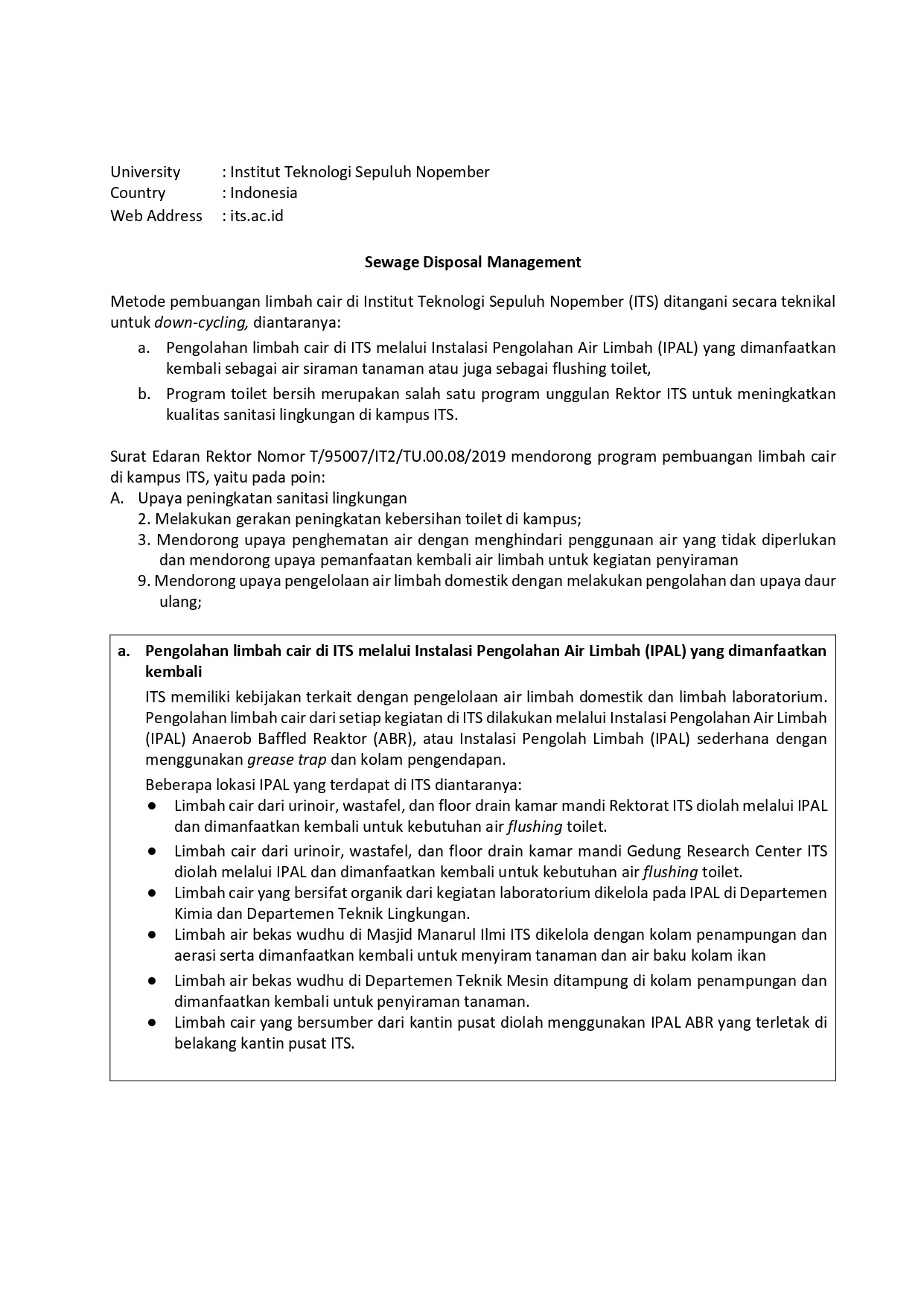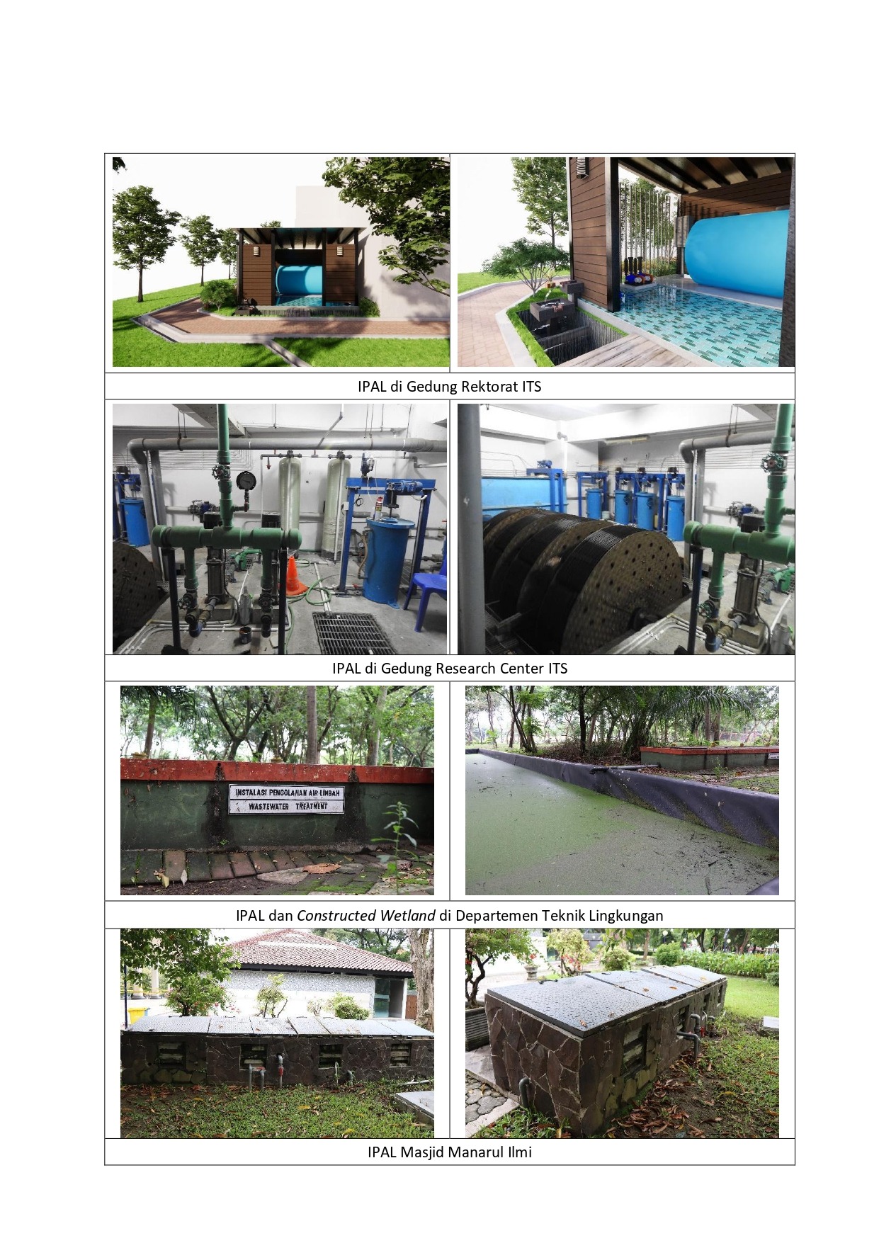 ITS has a waste treatment system to prevent water pollution. Wastewater management at ITS is regulated in Circular Letter of ITS Rector No. T-95007-IT2-TU.00.08-2019 about ITS’ Initiatives towards Sustainable and Environmental Friendly Campus, item A, where in point 3 it is explained that the ITS community strives to encourage efforts to save water by avoiding unnecessary water use and encouraging efforts to utilize water return of wastewater for watering activities, then at point 9 which is to encourage efforts to manage domestic wastewater by managing and recycling efforts. Waste water management at ITS is carried out through the installation of Anaerobic Baffled Reactor (ABR) Wastewater Management (IPAL) or simple WWTP using grease traps and settling ponds. These are the locations of IPAL: