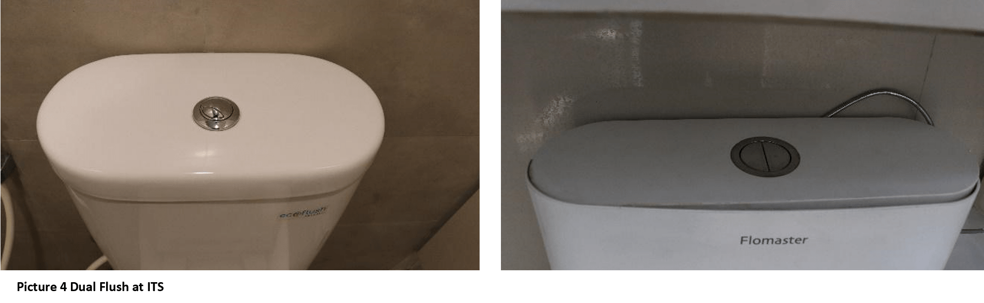 ITS adopts elevated structural types of buildings to ensure the easy movement of rainfall. In addition to building structures, ITS uses water-efficient equipment to replace conventional equipment in buildings. Water-saving equipment has been installed more than 50% in the campus environment. Such equipment consists of: