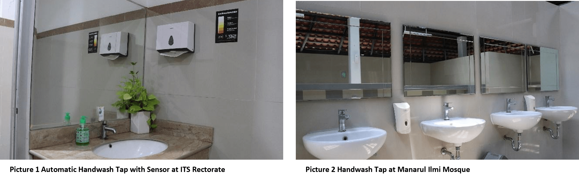 ITS has a hand washing tap as an effort to efficiently use water, which consists of a hand wash/sink with a manual water faucet, and a sink with an automatic water faucet with sensors. The automatic work mechanism reduces water waste caused by forgetting to turn off the faucet. The ITS rectorate building has a water tap installed. As part of an effort to conserve water, ITS includes a hand washing tap, which comprises of a hand wash / sink with a manual water faucet and a sink with an automatic water faucet with sensors. The automatic work mechanism reduces water waste caused by forgetting to turn off the faucet. The ITS rectorate building has a water tap installed by default. Manual tap hand washing installation can be found at numerous locations, including the Manarul Ilmi Mosque and the departments.
