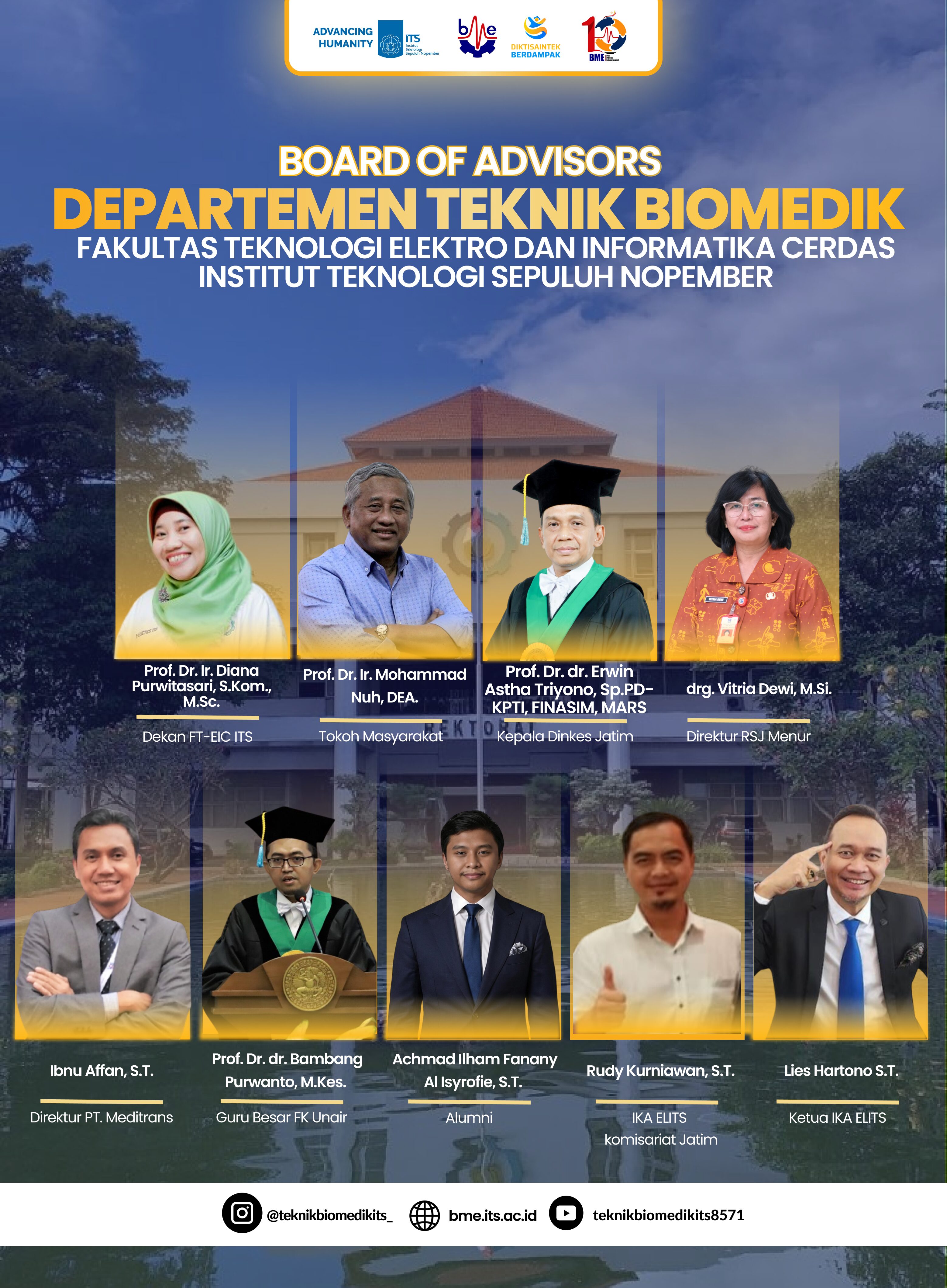 The Department of Biomedical Engineering was established based on the Decree of the Minister of Research, Technology and Higher Education Number: 102/M/Kp/III/2015 dated March 30, 2015. The ITS Biomedical Engineering Study Program was formed with a vision and mission to produce the next generation that has strong analytical and synthesis capabilities in the fields of Biomedical Instrumentation, Biomedical, Biomechanical, Biomedical, Biomaterial, and others.
