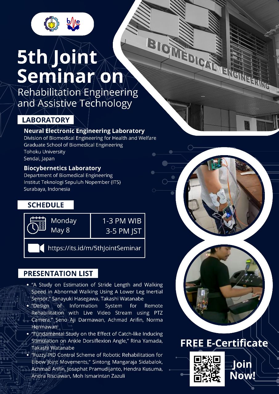 Presentation list: 1) “A Study on Estimation of Stride Length and Walking Speed in Abnormal Walking Using A Lower Leg Inertial Sensor,” Sanayuki Hasegawa, Takashi Watanabe 2) “Design of Information System for Remote Rehabilitation with Live Video Stream using PTZ Camera,” Seno Aji Darmawan, Achmad Arifin, Norma Hermawan 3) “Fundamental Study on the Effect of Catch-like Inducing Stimulation on Ankle Dorsiflexion Angle,” Rina Yamada, Takashi Watanabe 4) “Fuzzy-PID Control Scheme of Robotic Rehabilitation for Elbow Joint Movements,” Sintong Mangaraja Sidabalok, Achmad Arifin, Josaphat Pramudijanto, Hendra Kusuma, Andra Risciawan, Moh Ismarintan Zazuli