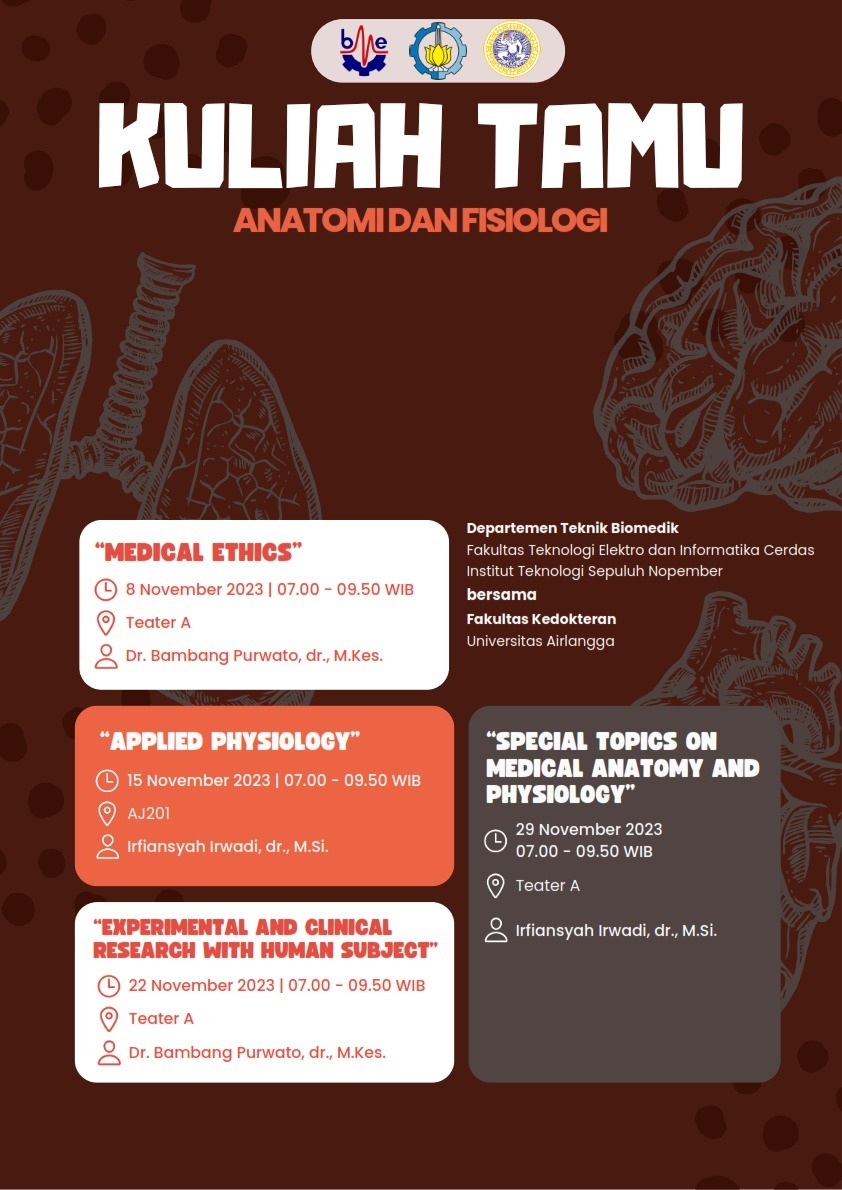 Departemen Teknik Biomedik akan menyelenggarakan rangkaian acara kuliah tamu “Anatomi dan Fisiologi” Semester Gasal Tahun Ajaran 2023-2024 dengan agenda sebagai berikut :