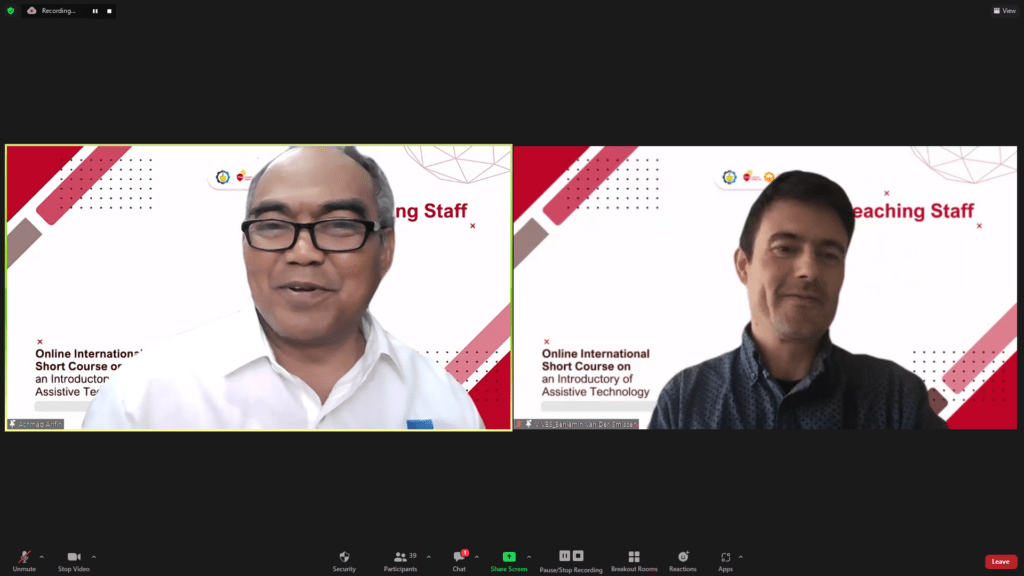 On Monday, 17 April 2023 the Department of Biomedical Engineering held the 1st Meeting of Online International Short Course on An Introductory of Assistive Technology, Institut Teknologi Sepuluh Nopember (ITS) in partnership with Vives University of Applied Sciences. This activity takes place online via Apk Zoom. The following is documentation of the activities that have taken place: