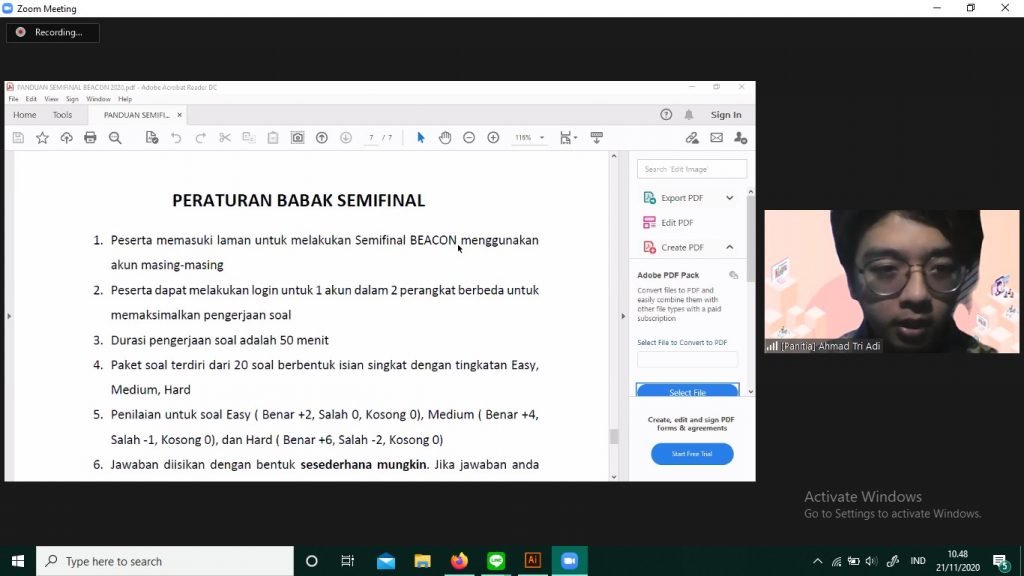 Pada 21 November 2020 telah diselenggarakan babak semifinal dari acara Biomedical Engineering Annual Contest 2020 (BEACON 2020), acara dimulai pada pukul 09.30 WIB dan diawali dengan penjelasan teknis dan test server oleh panitia kepada seluruh peserta. Kemudian dilanjutkan dengan pengerjaan soal oleh seluruh peserta dan tim soal. Berikut ini dokumentasi babak semifinal Beacon 2020 :