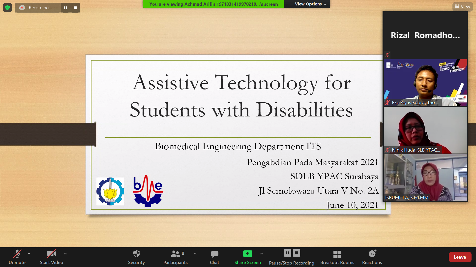 Pada hari Kamis, 10 Juni 2021 Departemen Teknik Biomedik mengadakan Diskusi Peluang Kegiatan Bersama Terkait Assistive Technology untuk Pembelajaran dengan Sekolah Dasar Luar Biasa (SDLB) YPAC Surabaya. Berikut ini galeri foto dokumentasi kegiatan kuliah tamu project design di Departemen Teknik Biomedik :