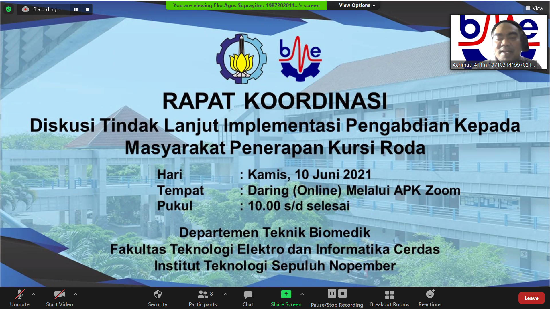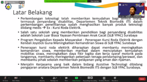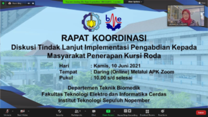 Pada hari Kamis, 10 Juni 2021 Departemen Teknik Biomedik mengadakan Diskusi Tindak Lanjut Implementasi Pengabdian Kepada Masyarakat Penerapan Kursi Roda Elektrik dengan Kendali Joystick dengan Sekolah Dasar Luar Biasa (SDLB) YPAC Surabaya. Berikut ini galeri foto dokumentasi kegiatan kuliah tamu project design di Departemen Teknik Biomedik :