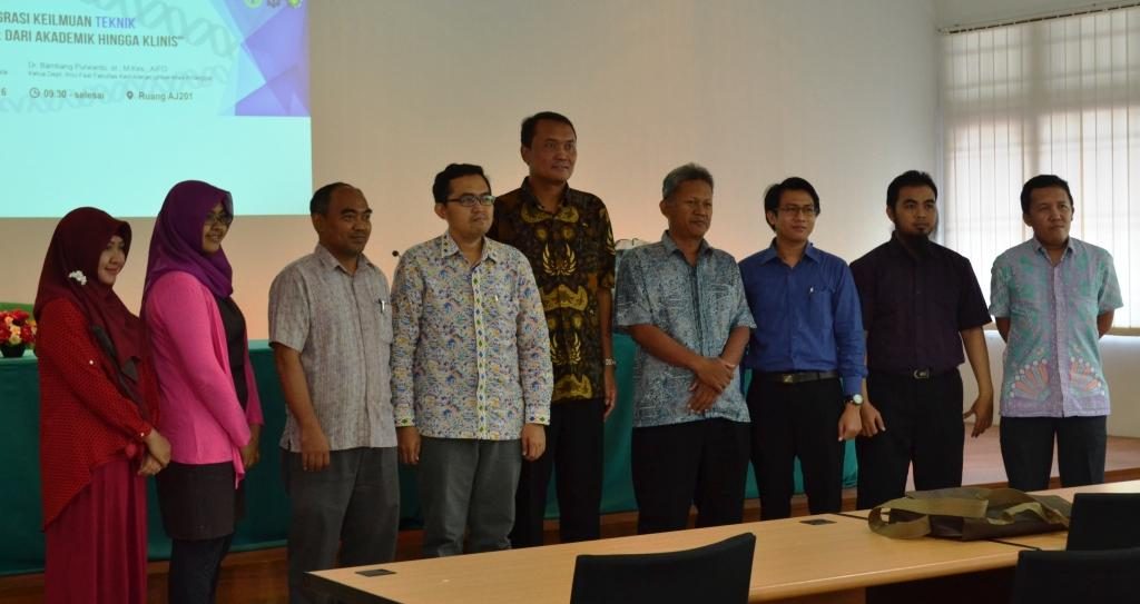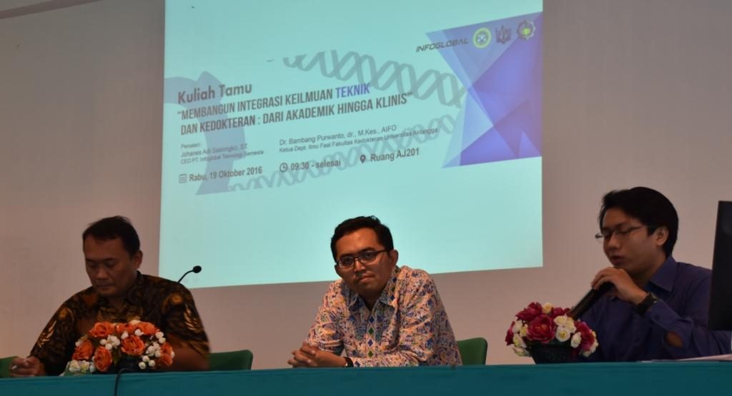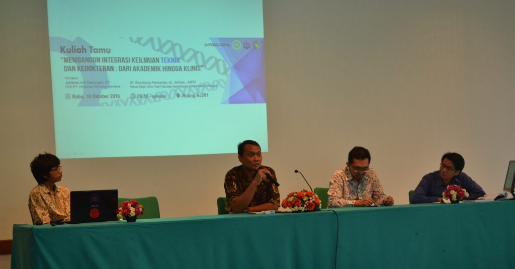 Kuliah tamu dengan tema “Membangun Integrasi Keilmuan Teknik dan Kedokteran: dari Akademik hingga Klinis dilaksanakan pada hari Rabu tanggal 19 Oktober 2016. Pembicara dari kuliah tamu ini adalah Dr. Bambang Purwanto, dr. M. Kes, AIFO dari Departemen Ilmu Faal Fakultas Kedokteran Universitas Airlangga dan Johanes Adi Sasongko,S.T. dari PT Infoglobal Teknologi Semesta.