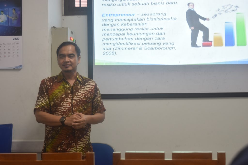 Rudy Kurniawan, S.T. sedang memberikan materi tentang kewirausahaan pada kuliah tamu proyek disain di Departemen Teknik Biomedik.
