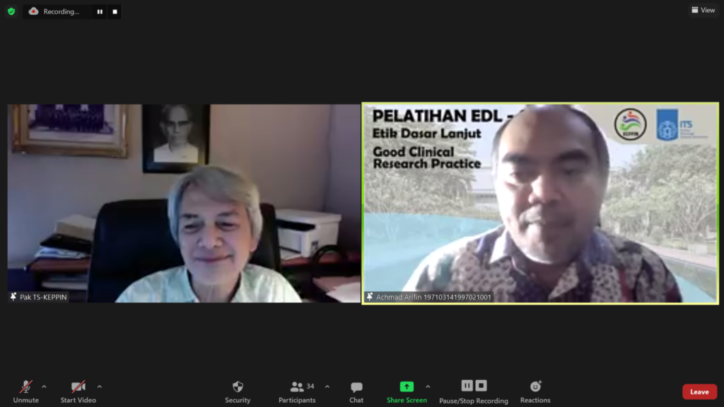 Pada tanggal 23-25 Juni 2021, Dosen dan Tenaga Kependidikan Departemen Teknik Biomedik mengikuti pelatihan Etik Dasar Lanjut Good Clinical Research Practice. Kegiatan ini dilaksanakan secara online melalui apk zoom dengan narasumber dr. Triono Soendoro, M.Sc., M.Phil., Ph.D. Pelatihan ini juga diikuti oleh segenap civitas akademik dari departemen lain di ITS. Berikut ini foto dokumentasi Pelatihan Etik Dasar Lanjut Good Clinical Research Practice :