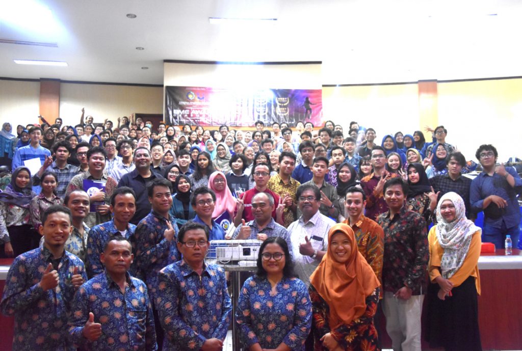 Dosen, tenaga kependidikan, dan mahasiswa melakukan sesi foto bersama pada kegiatan BME Awards di gedung Teater C ITS.