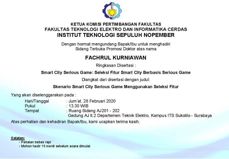 SIDANG TERBUKA PROMOSI DOKTOR FACHRUL KURNIAWAN 07111460012002 Ringkasan Disertasi : SMART CITY SERIOUS GAME: